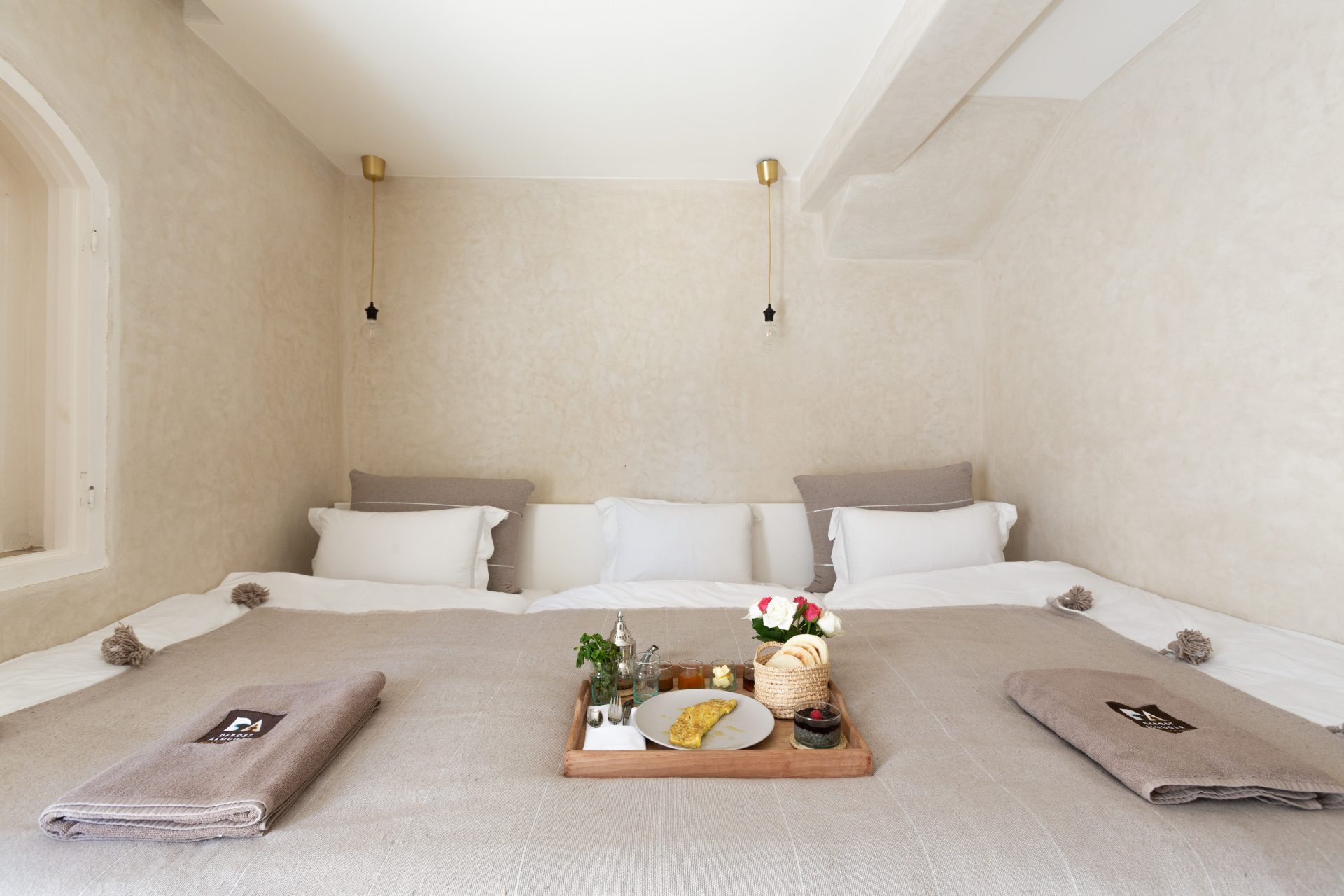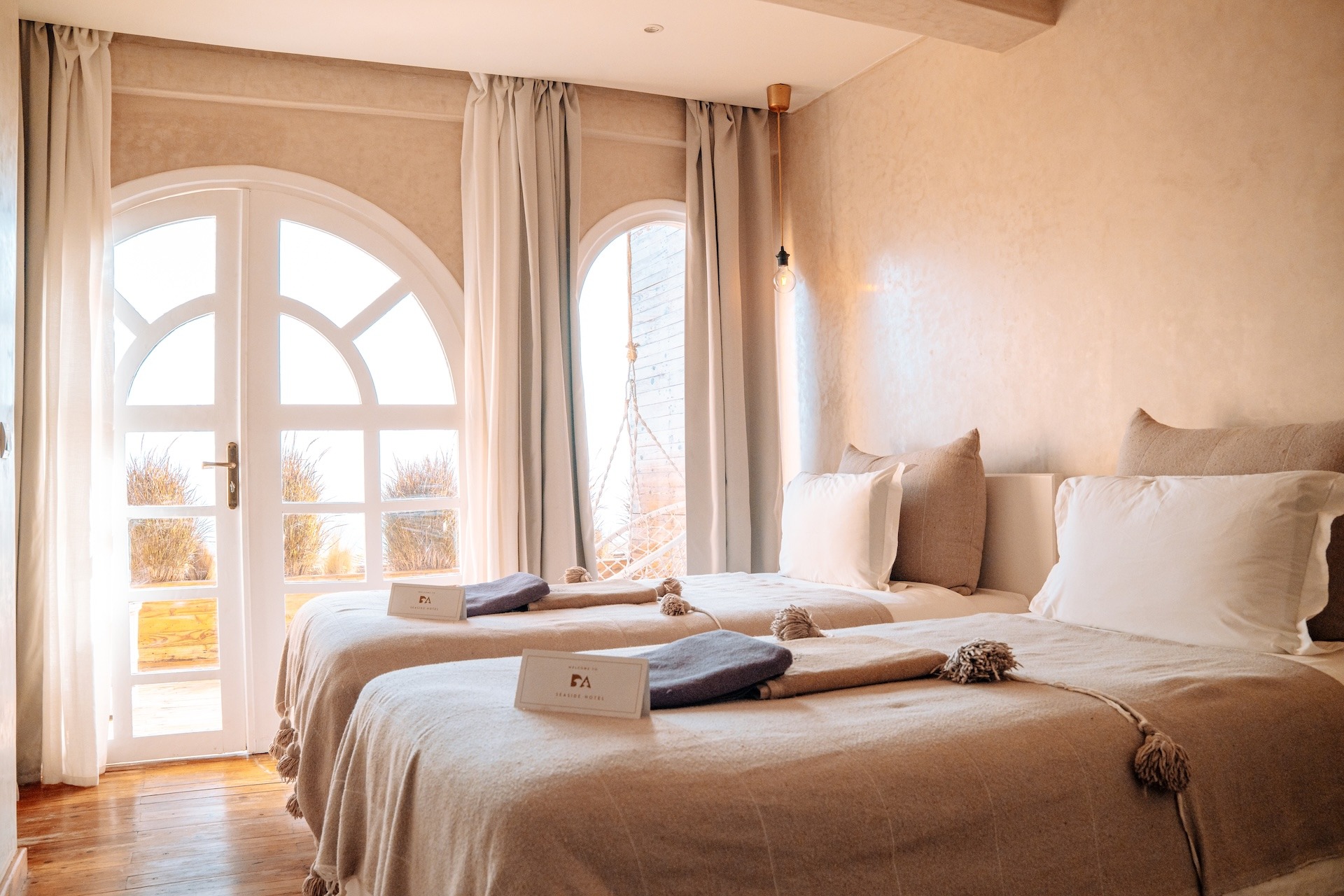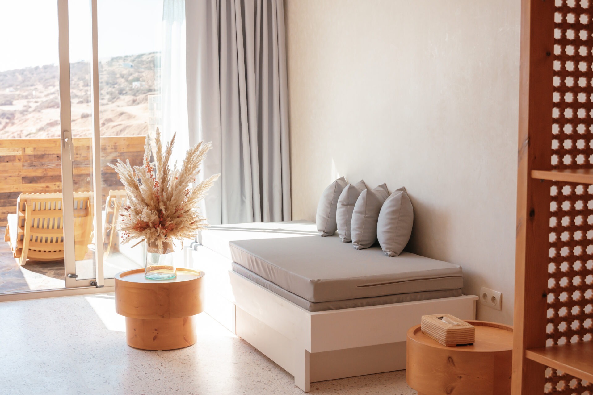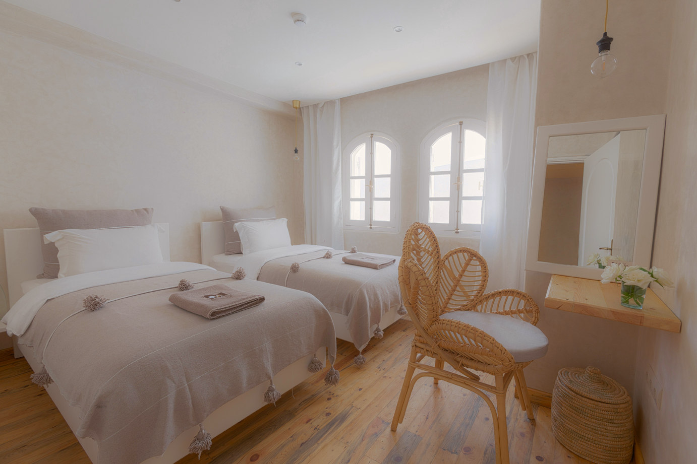 Standard Room mountain view or Patio view Everything you need during your holiday seaside. Twin bed with comfy mattress, selection of pillows, bed linen & sitting area. With around 20m², the Standard room offers everything you need during your holiday by the sea. Each room is decorated in a unique, natural, Moroccan style to ensure you relax and unwind. Twin bed or family bed 3×2 m with comfortable mattress and a selection of pillows and bed linen, with seating possibilities and a private bathroom.