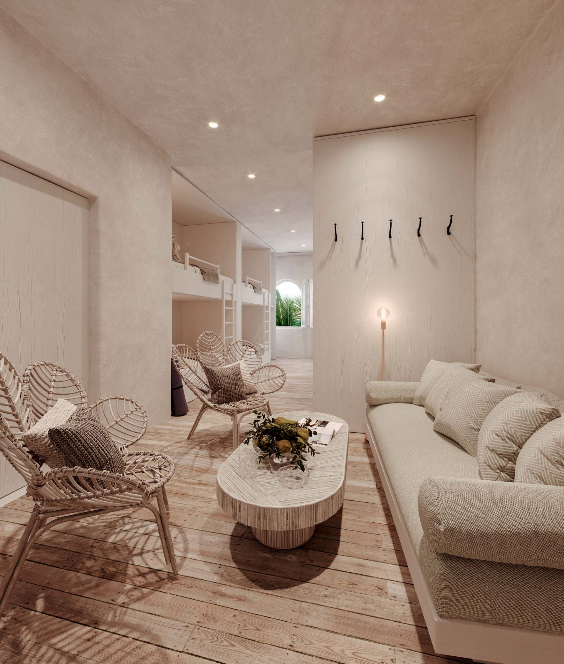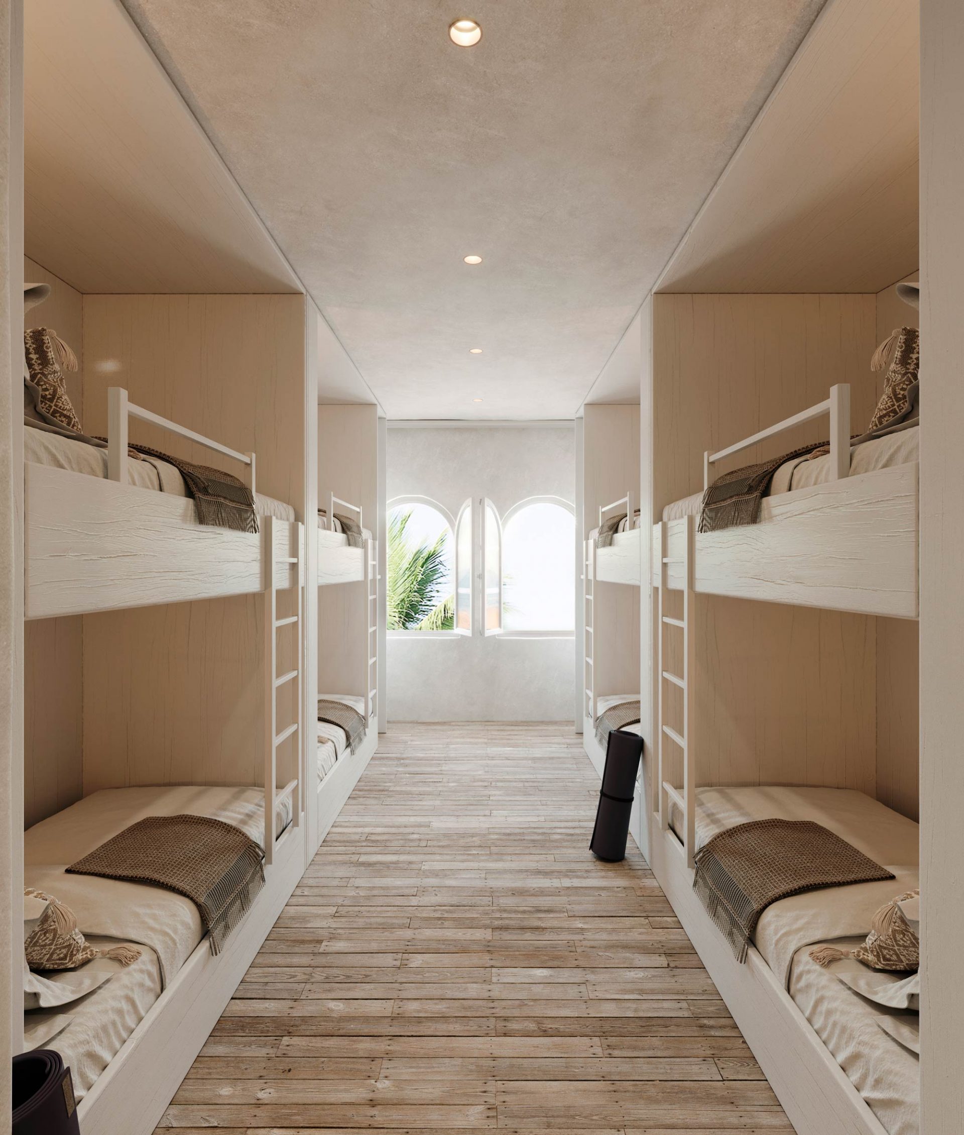 Shared Bunk Standard Room, 4 bunkbeds max. 8 people, 2 bathrooms. For everyone looking for a unique styled place but traveling on a budget. With 40 square meters (430 square foot) our spacious Shared Standard rooms are all you need to spend a holiday in a unique setting in style but also on a budget. Groups can also profit from those rooms. Seaside Hotel offers the Shared Standard rooms gender mixed meaning for male and female guests. Each room comes with 2 bathrooms inside the room and 4 bunk beds for maximum 8 people. Each bed has its own private area with an individual lightning and a locker for your personal belongings and a safe. Each bed has a comfortable matress and a selection of pillows and bed linen. The room also has a lovely sitting lounge area