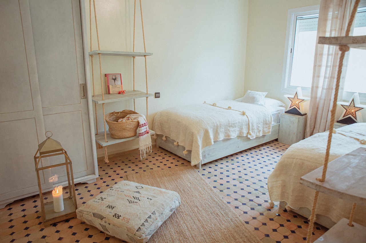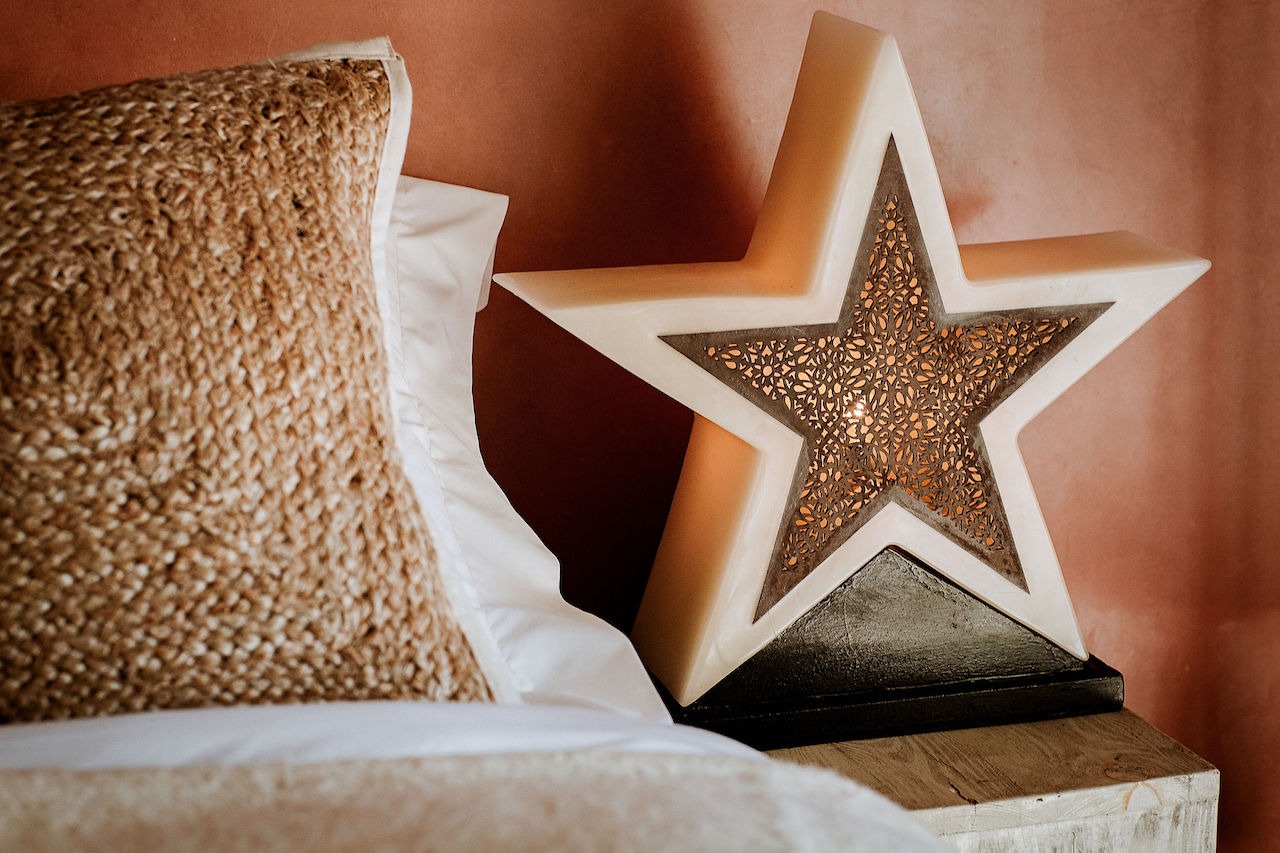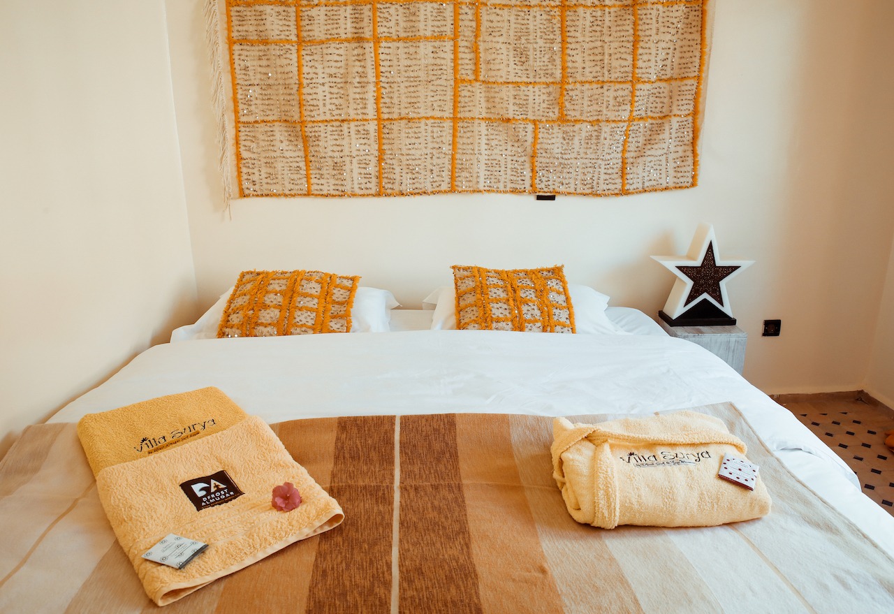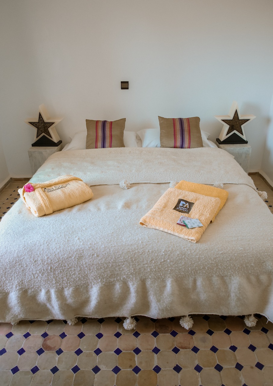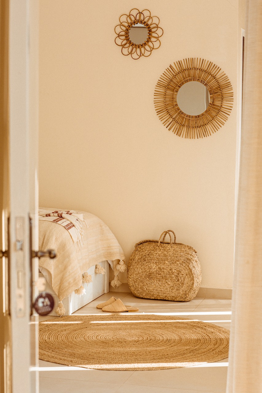 All rooms are decorated in a modern bohemian Morocco style. You sleep in handmade wooden beds with ergonomic mattresses and Egyptian cotton sheets.
