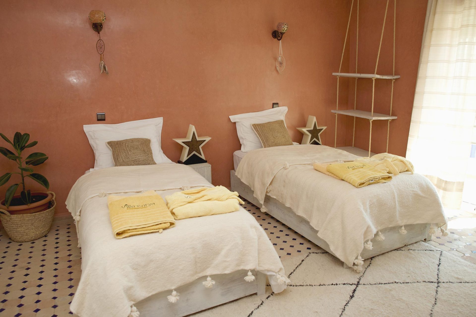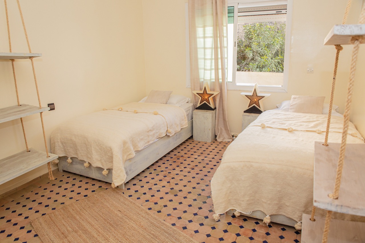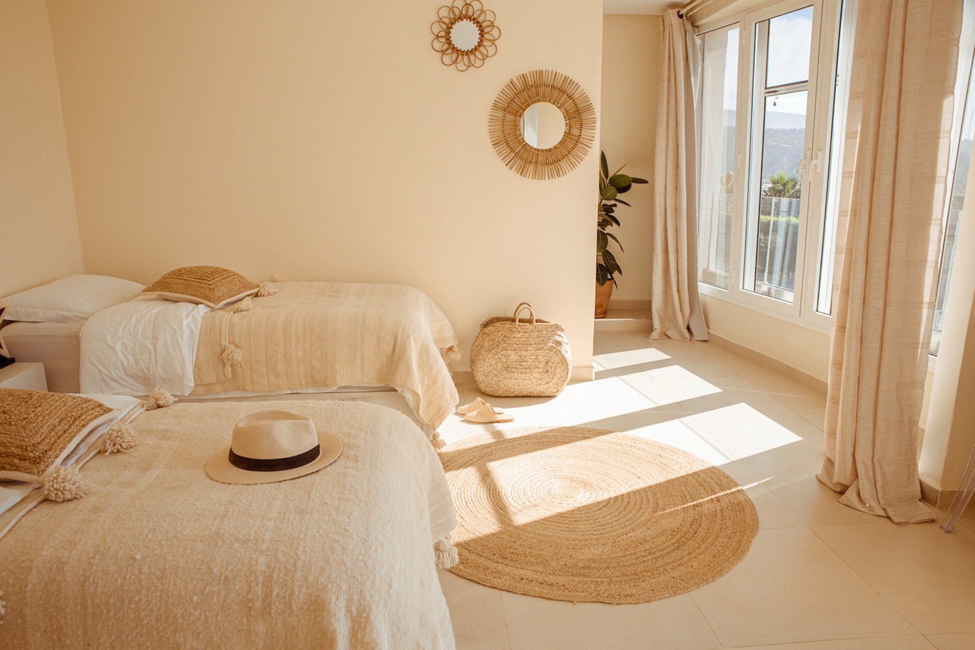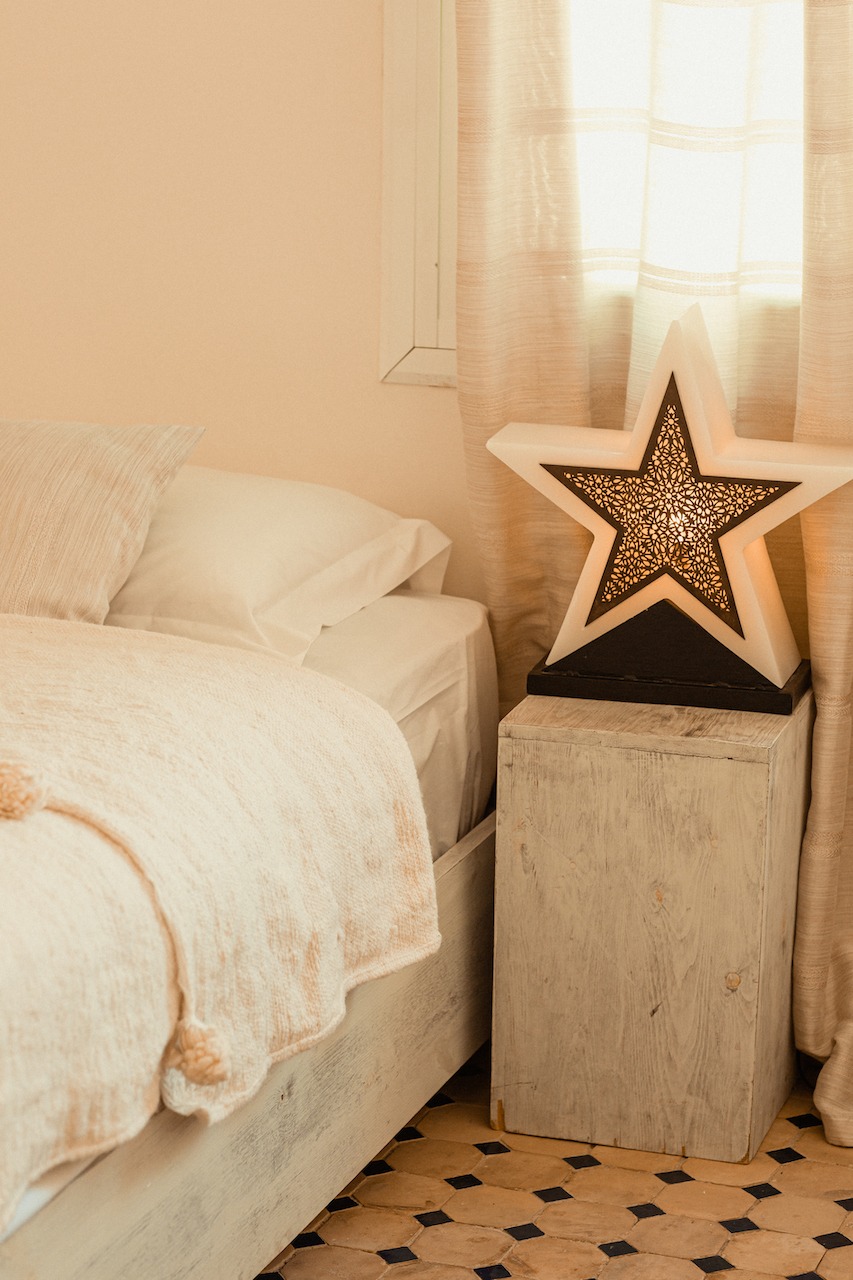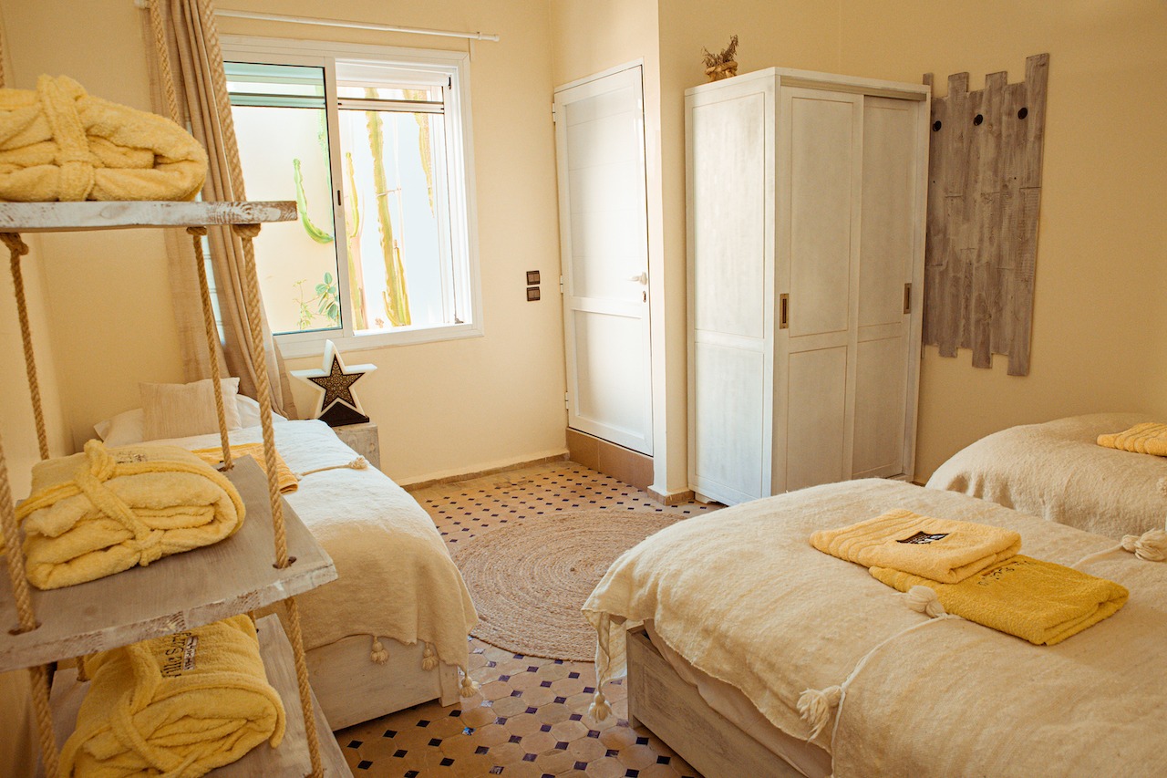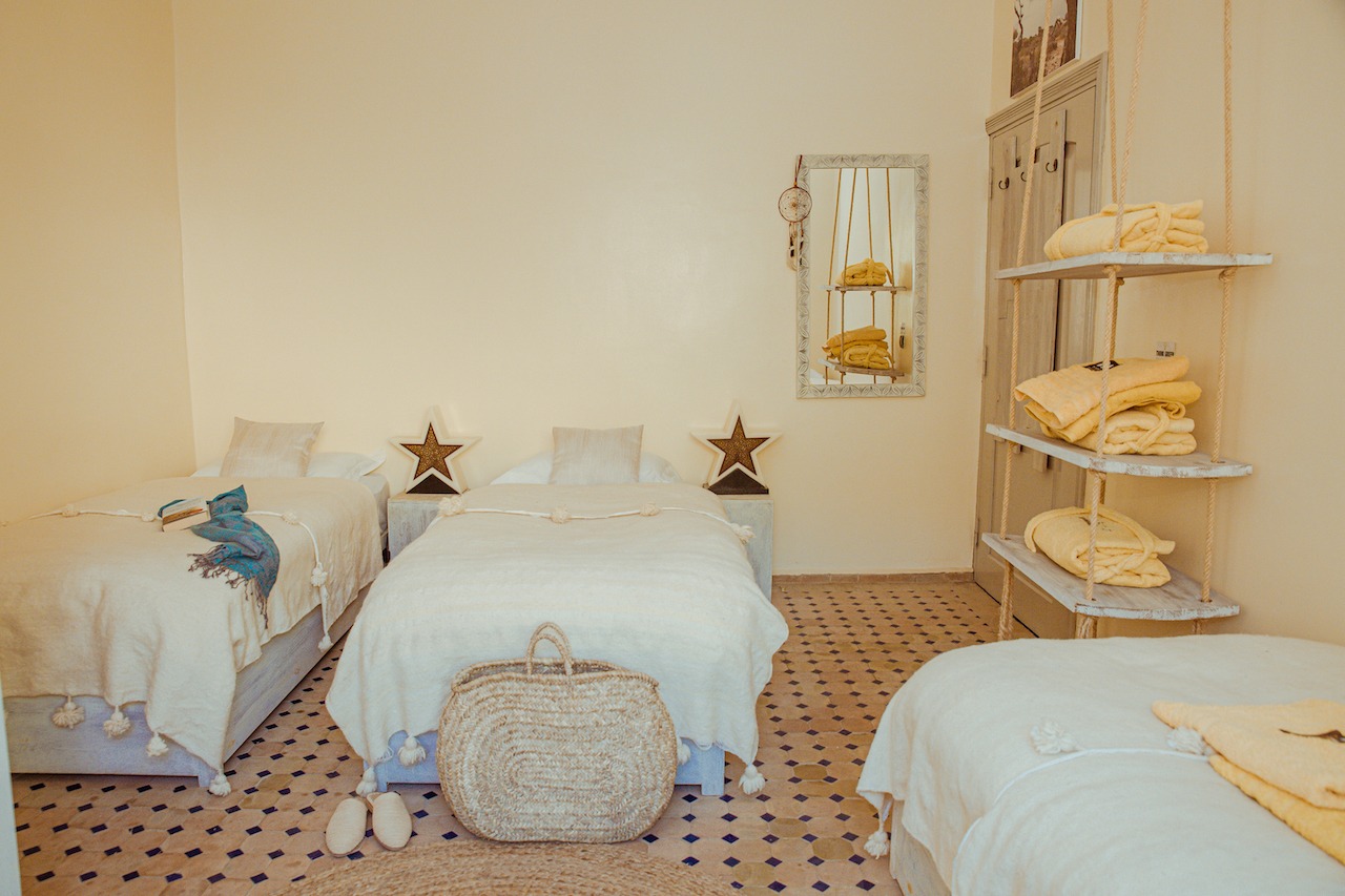 All rooms are decorated in a modern bohemian Morocco style. You sleep in handmade wooden beds with ergonomic mattresses and Egyptian cotton sheets.